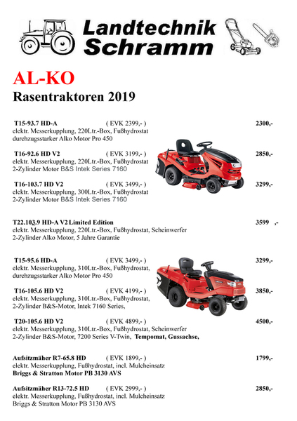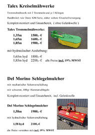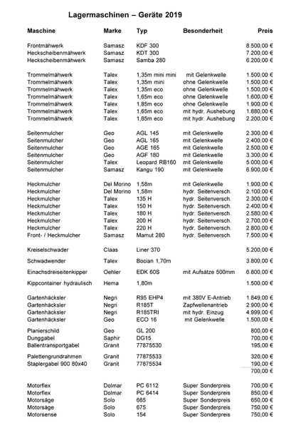 Bitte beachten Sie bei diesen Angeboten, dass alle Maschinen und Geräte völlig montiert, mit Betriebsstoffen befüllt und ausprobiert an Sie übergeben werden.
